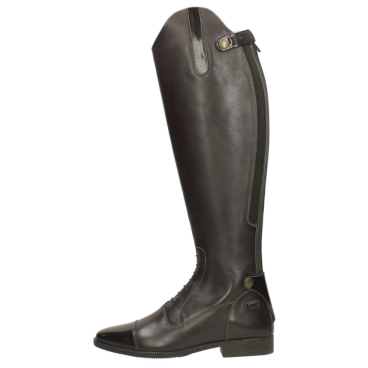 - ritssluiting aan de achterzijde tot aan de zool met overslag met drukknoopsluiting
