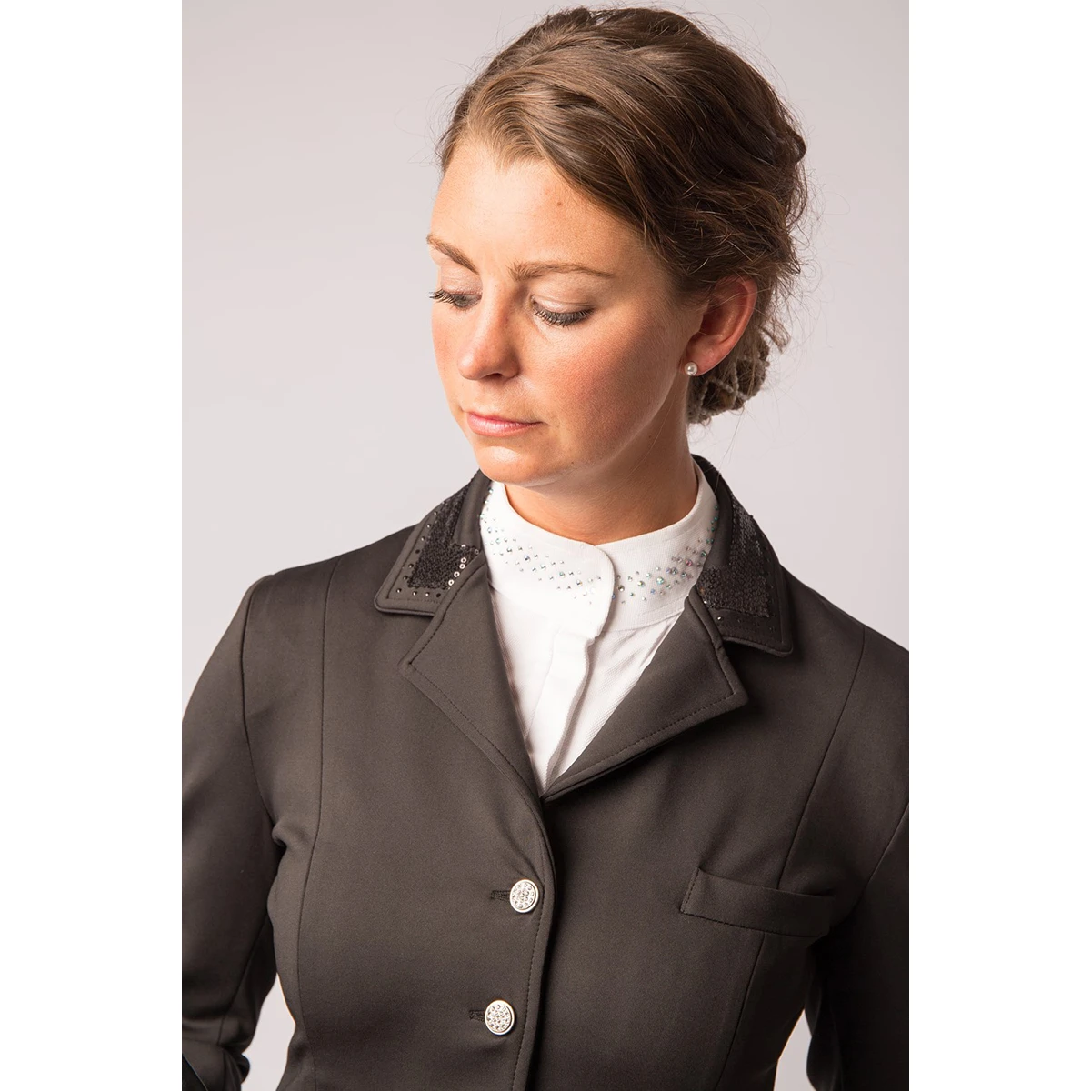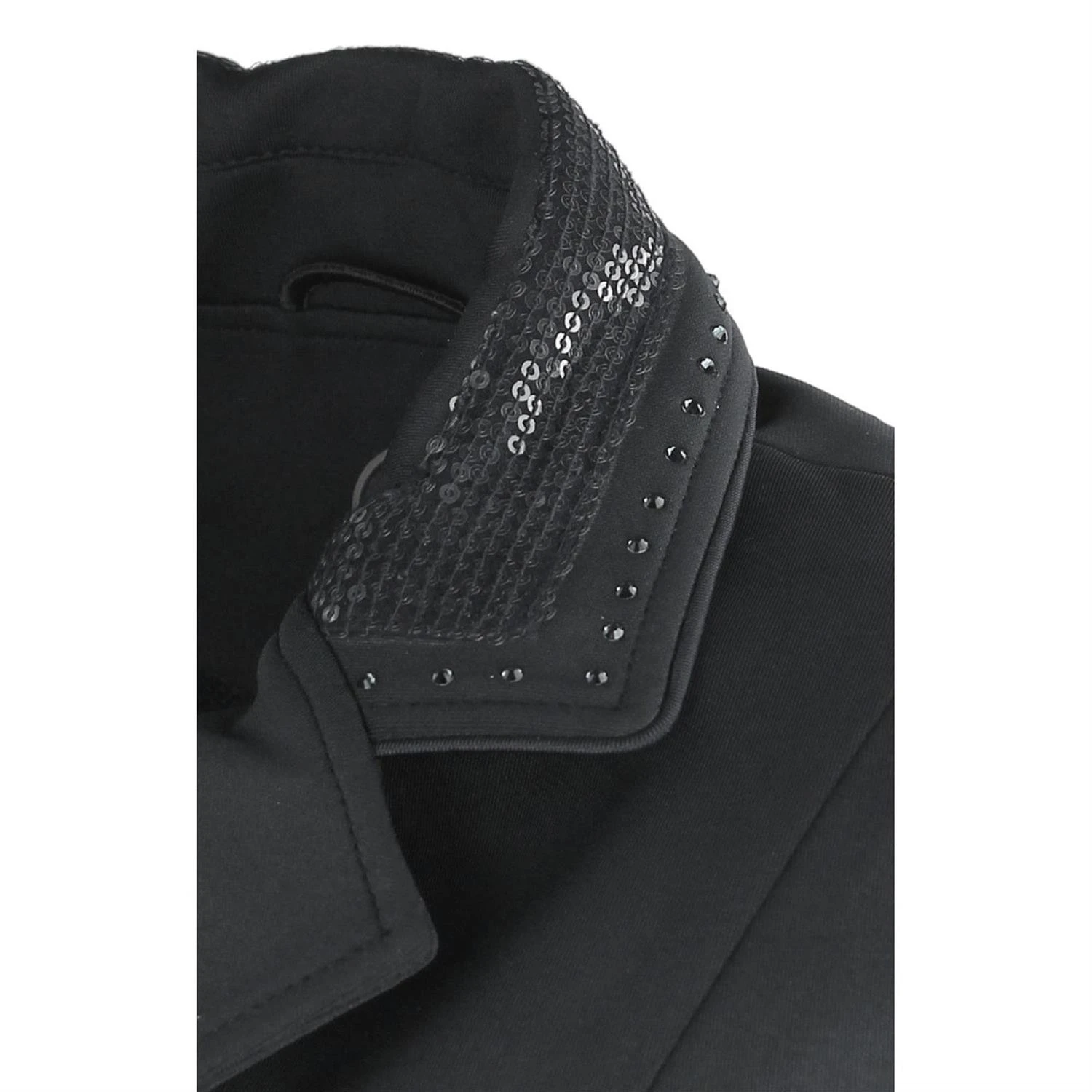 - de kraag, giletflapjes en band op de achterzijde zijn voorzien van tone/tone pailletten en crystallen en een piping