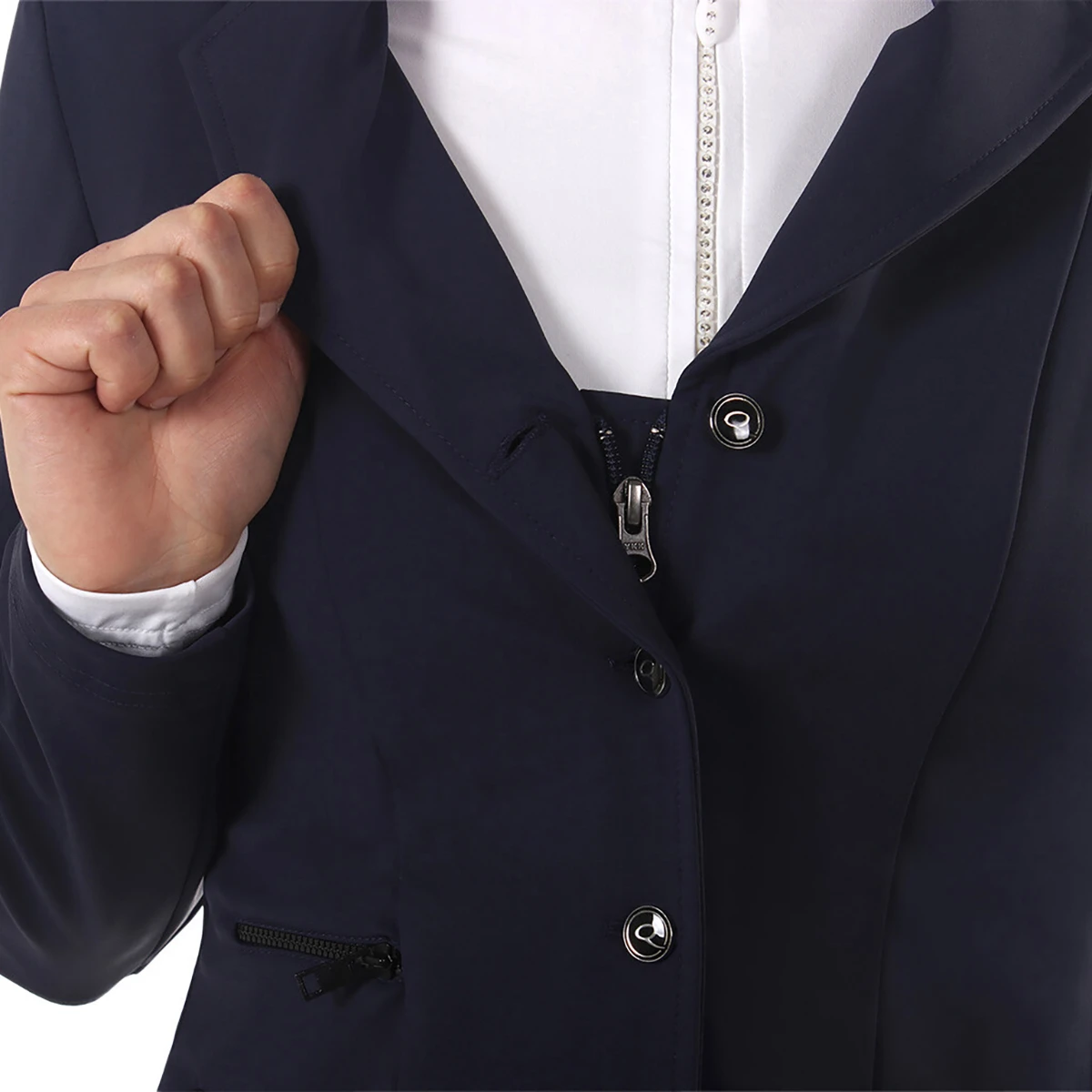 - voorzien van een verborgen ritssluiting achter de knoopsluiting, voorkomt dat de knopen gaan trekken