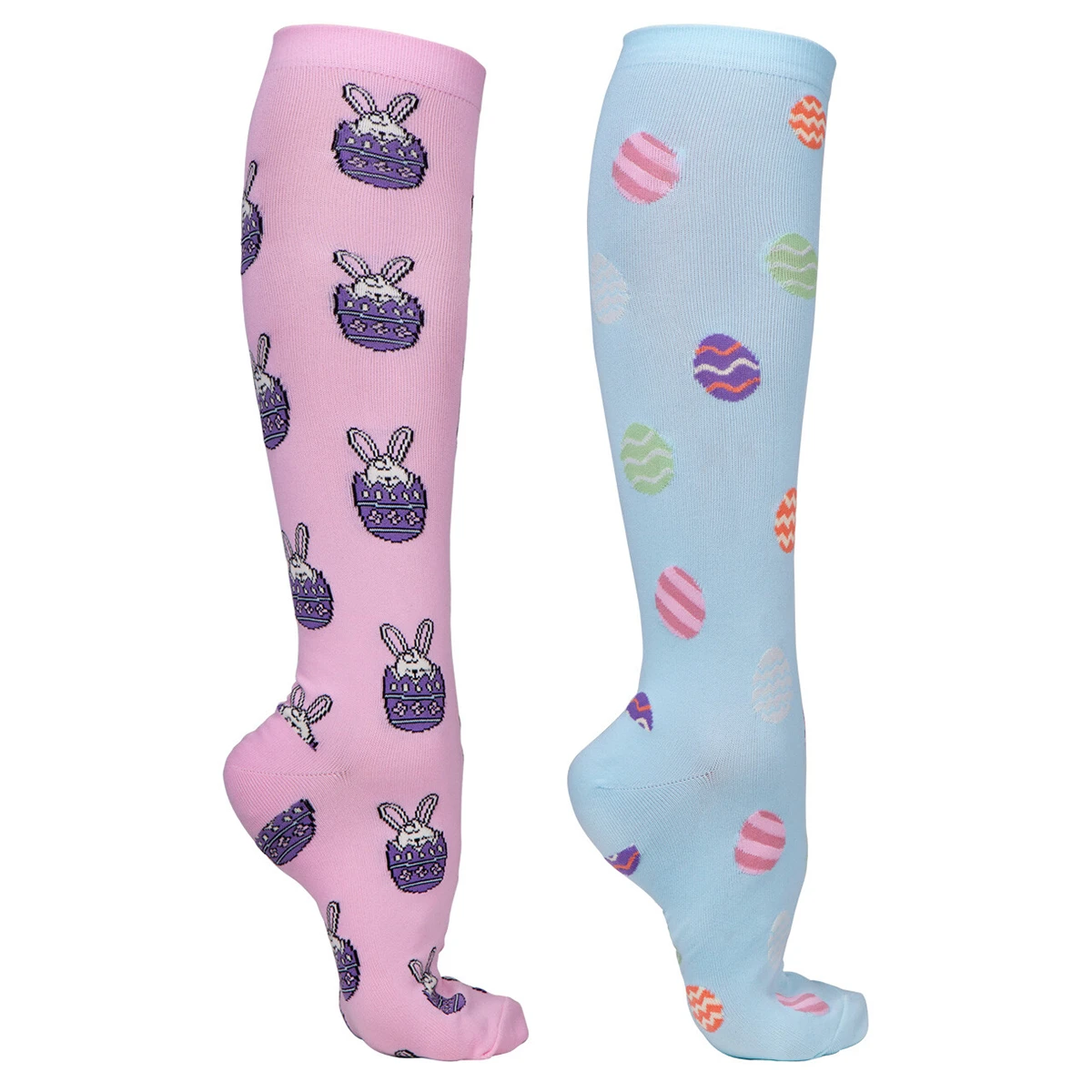 - de blauwe sokken zijn gedecoreerd met gekleurde paaseitjes print